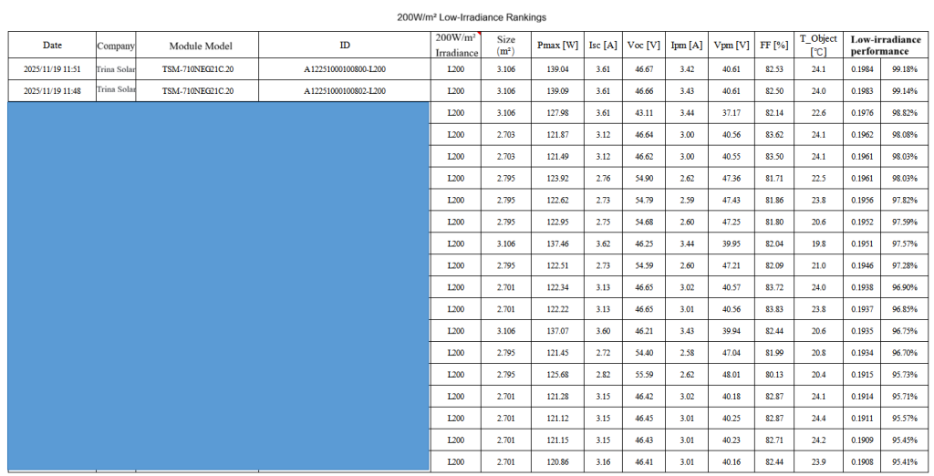 Recently, the results of the SOLARBE TEST Awards for PV Module on Specific Performance Index (2025), jointly launched by Carbon Discovery, Solarbe, and Gsolar Test, were officially announced. Trina Solar Co., Ltd. demonstrated exceptional low-irradiance response performance. In tests under low-irradiance conditions of 200 W/m², it achieved a Low-Irradiance Performance Ratio of 99.18% (calculated as: Power at 200 W/m² × 5 ÷ Power at 1000 W/m²), standing out among 13 competing module models to secure the award for Champion of PV Module Low-Irradiance Performance. This achievement not only serves as authoritative recognition of Trina Solar’s technical prowess but also, through empirical data, validates the core value of low-irradiance performance, providing substantial support for the industry to move beyond marketing claims and establish scientific product selection standards.