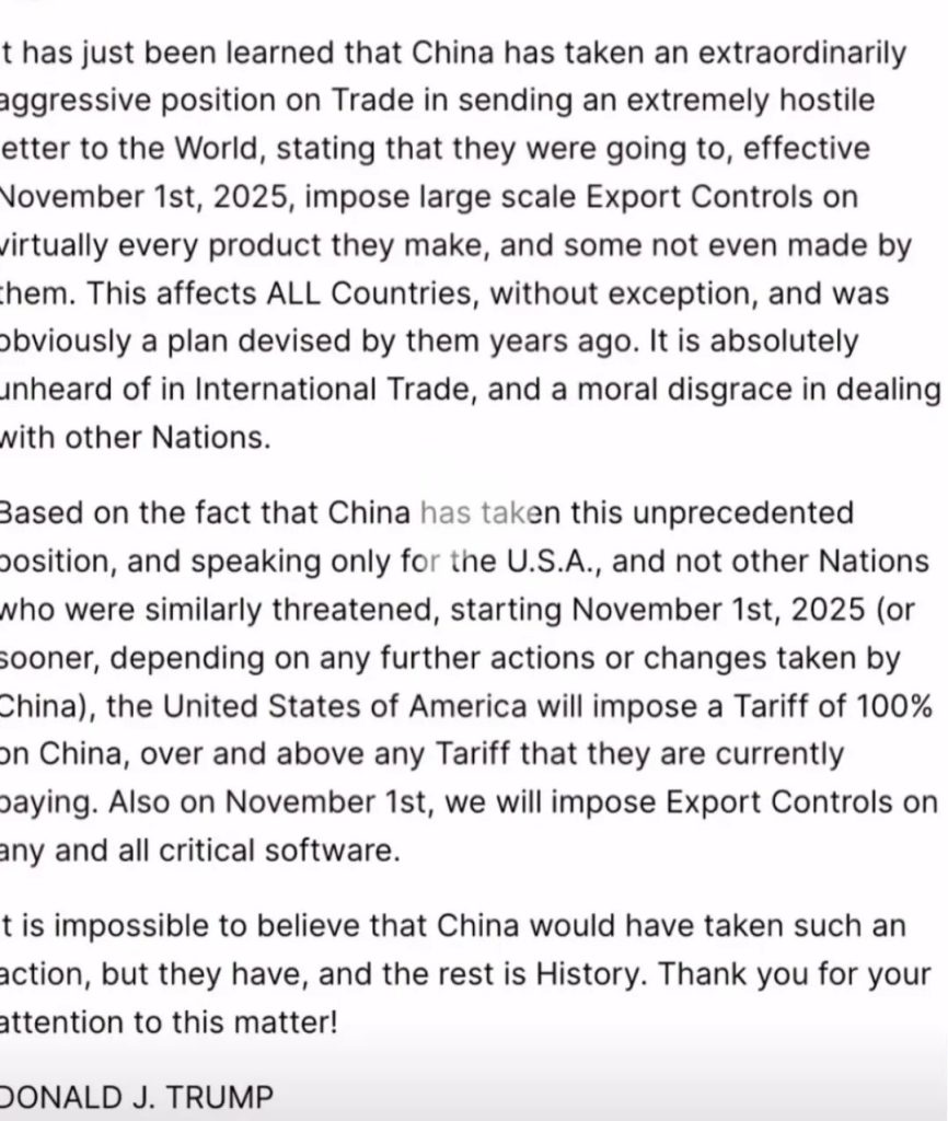 On October 10, 2025, former US President Donald Trump announced a plan to impose an additional 100% tariff on all Chinese imports effective November 1, 2025 . Combined with existing tariffs, the actual tax rate would surge significantly. He also declared that export controls would be implemented on all critical software simultaneously .