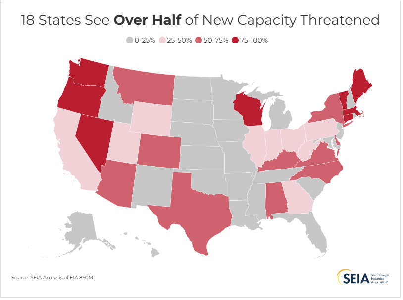 A new SEIA analysis of U.S. Energy Information Administration (EIA) data shows that 73 GW of solar and 43 GW of storage projects, which have not yet received all necessary federal, state, and local permits, are at risk of being targeted. These projects, spread across 44 states, could provide enough electricity to power 16 million homes. They represent the core of America’s energy future and are essential for meeting soaring demand and keeping prices affordable.