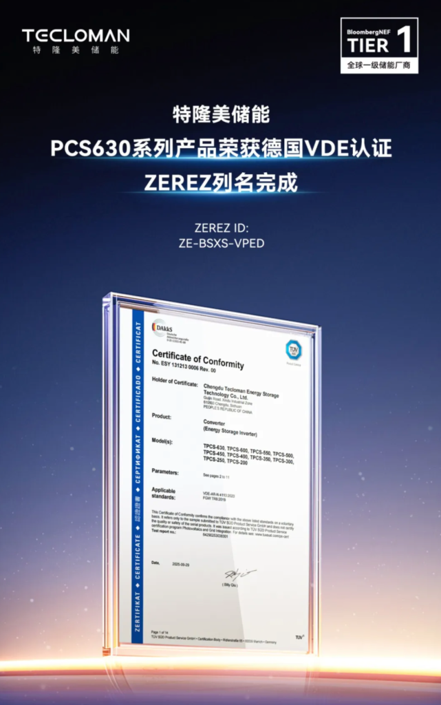 Recently, Tecloman’s 630kW PCS energy storage product successfully passed testing by the German TÜV SÜD certification body and has completed its listing on the German ZEREZ platform (ZEREZ ID: ZE-BSXS-VPED). This signifies that Tecloman’s energy storage inverter technology has officially received authoritative recognition from the German grid, granting it grid-connection qualification for European medium-voltage networks.