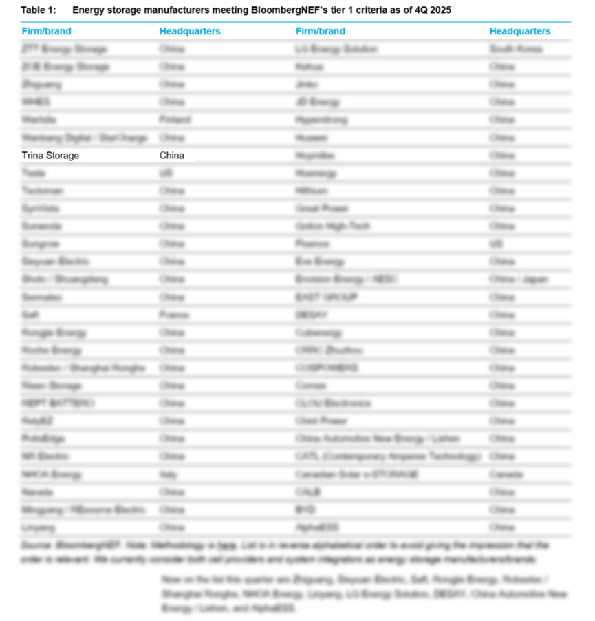 Trina Storage has once again been recognized as a Tier 1 energy storage system manufacturer by BloombergNEF (BNEF) in its Q4 2025 global rankings. This marks the eighth consecutive quarter that Trina Storage has maintained this prestigious designation – one of the longest-standing records in the industry – underscoring its leading comprehensive capabilities as a global energy storage system solutions provider. The repeated recognition highlights Trina Storage’s outstanding system integration capabilities, continuous technological innovation, and strategic focus on solar-storage synergy.