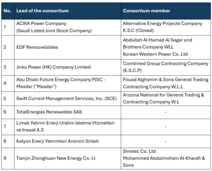 - France’s EDF Renouvelables, Kuwait’s A.H. Al-Sagar & Bros., and South Korea’s Western Power Company;